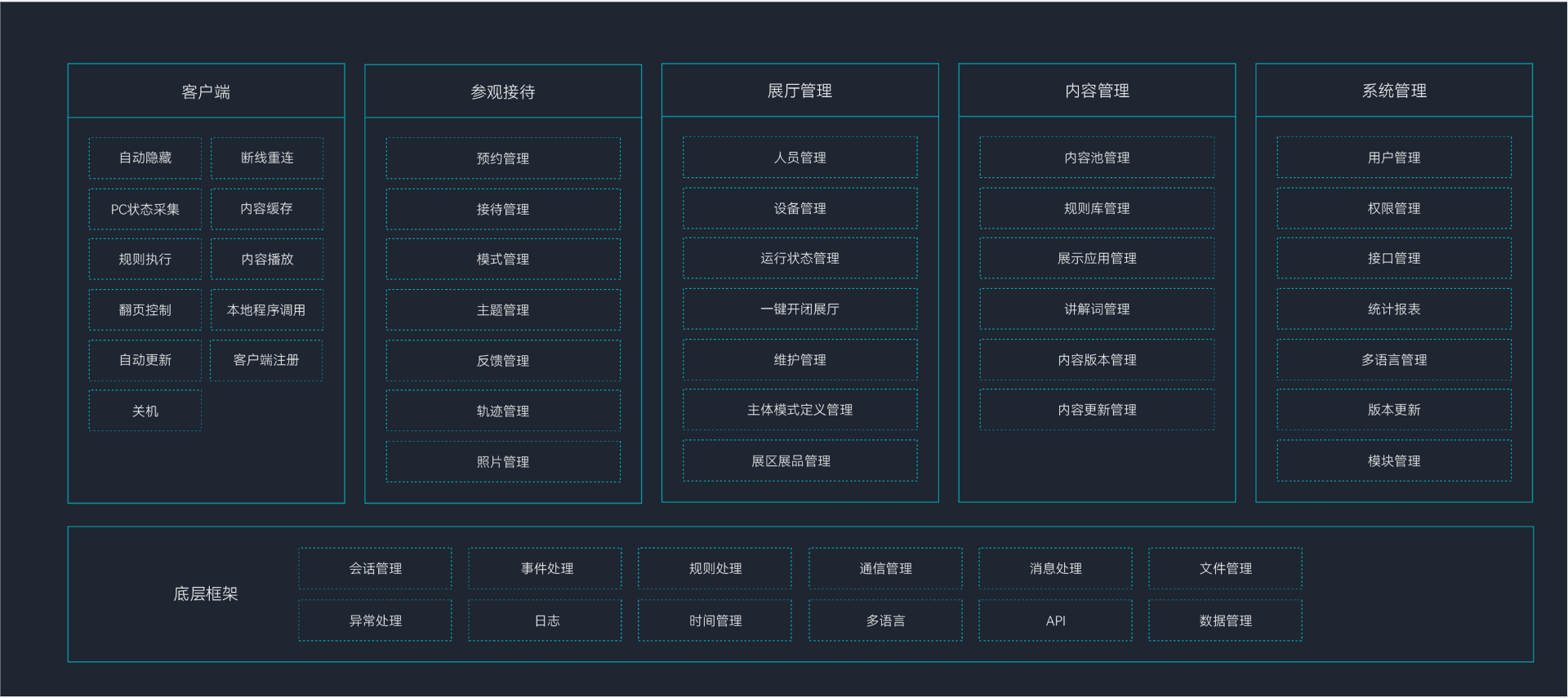 全生命周期的展厅管理平台,保证展厅高效稳定的运营效率;基于SAAS服务的管理平台;本地展示内容可以无缝部署到多处异地展示厅;具备对各种形式展示空间以及数字屏幕内容提供管理功能扩展性